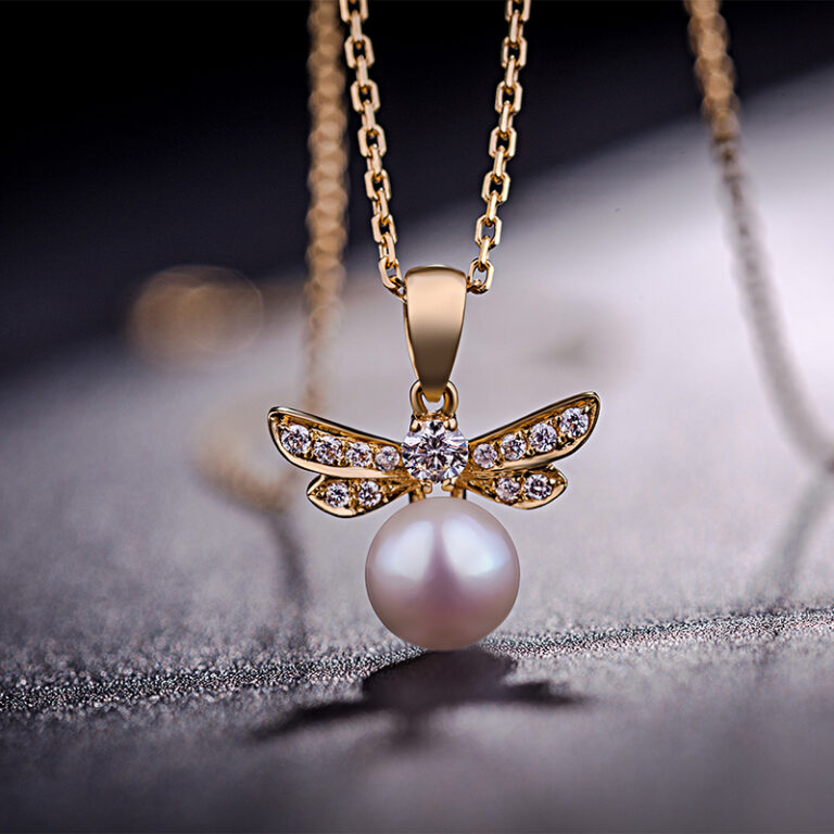18K Yellow Gold Dragonfly Necklace with Akoyo Pearl and Diamond