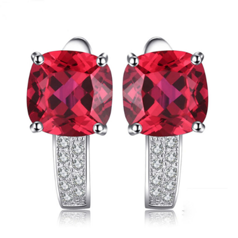 925 Silver Earrings with Cushion Cut Ruby Color CZ Stone