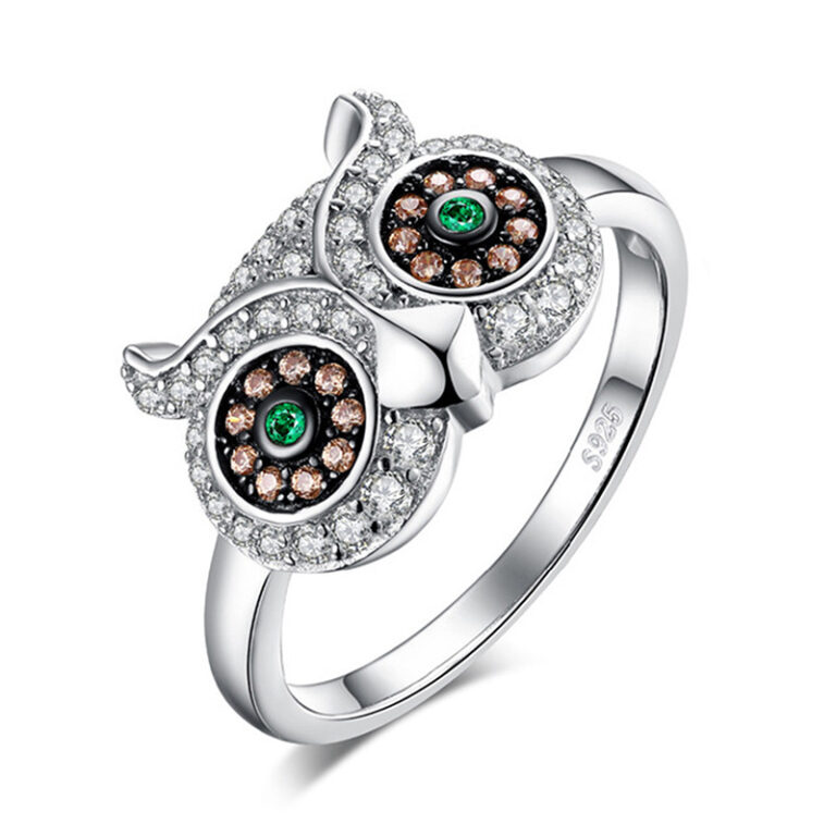 Owl Silver Rings with Green Stone