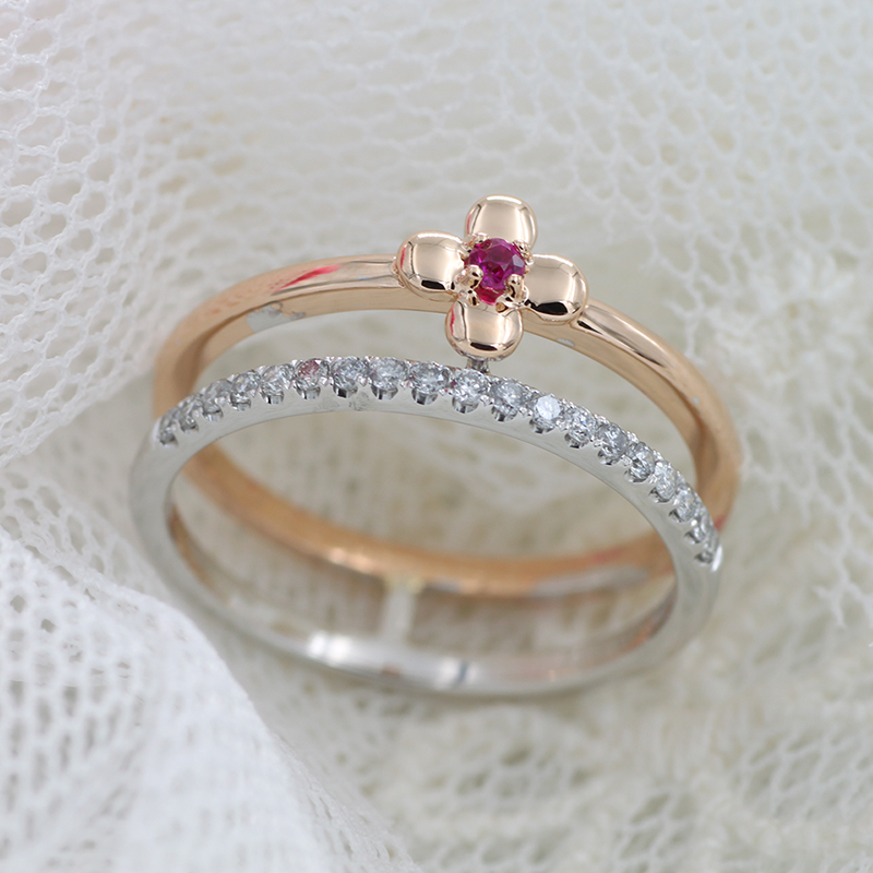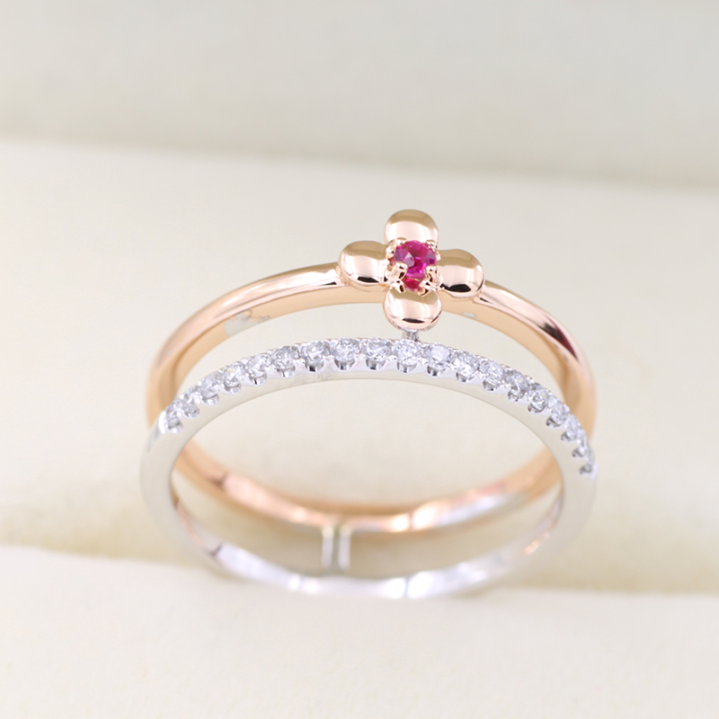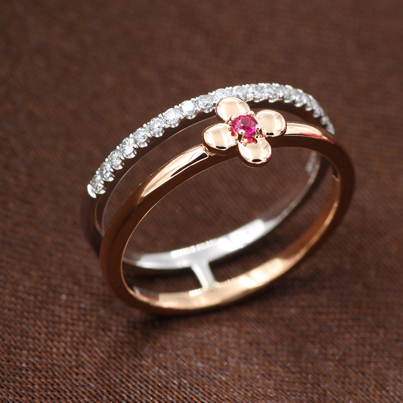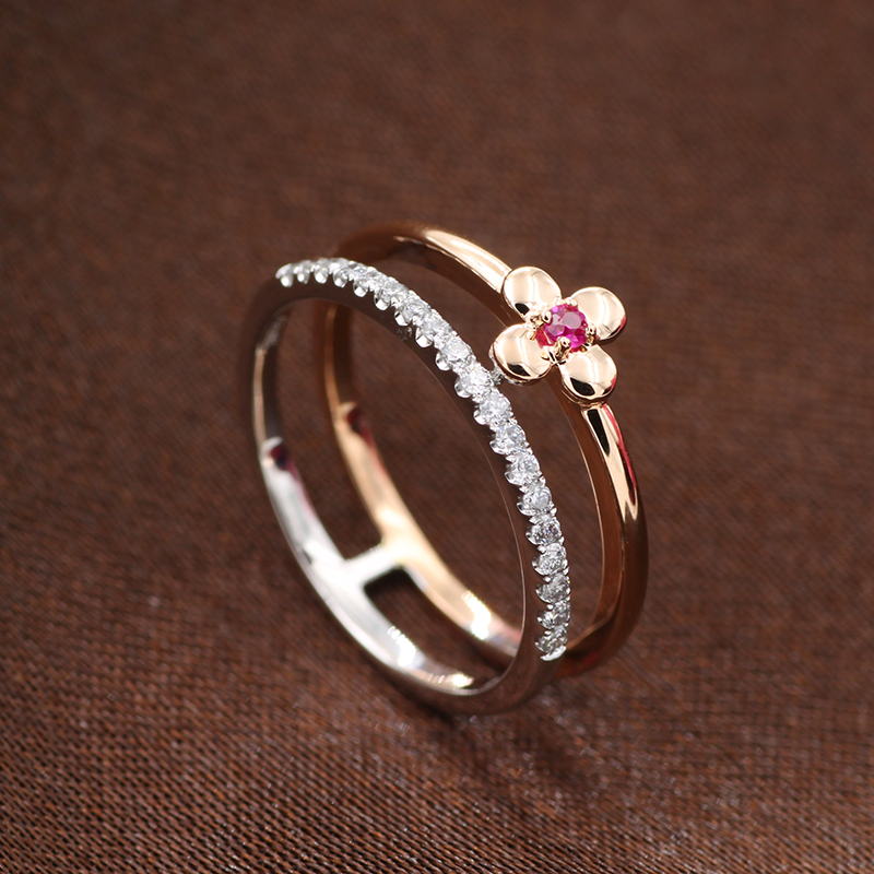 14K Yellow and White Gold Four Leaves Diamond Rings with Ruby Gemstone